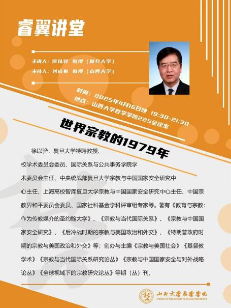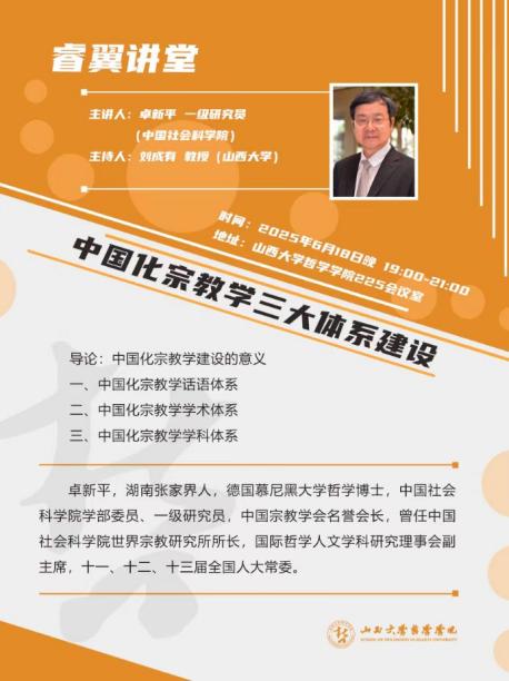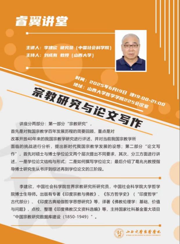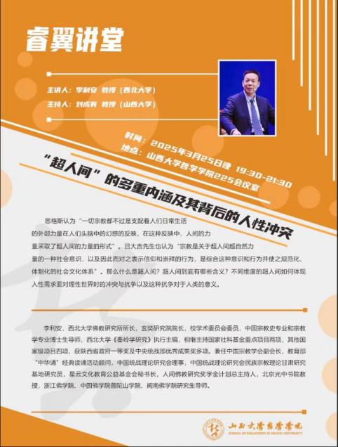 2025年春季学期,公司宗教学专业共举办四场学术讲座,先后是西北大学李利安教授的“‘超人间’的多重内涵及其背后的人性冲突”、复旦大学徐以骅教授的“世界宗教的1979年”、中国社会科公司卓新平研究员的“中国化宗教学三大体系建设”、中国社会科公司李建欣研究员的“宗教研究与论文写作”。讲座均由宗教学方向带头人刘成有教授主持。