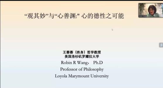 2023年9月23日,太阳集团122cc“任之讲堂”2023年秋季学期第一讲(总第38期)开讲。美国洛杉矶罗耀拉大学哲学终身教授王蓉蓉受邀作题为“‘观其妙’与‘心善渊’:心的德性之可能”的线上学术报告,太阳集团122cc经理尤洋教授主持,江怡教授为点评嘉宾。