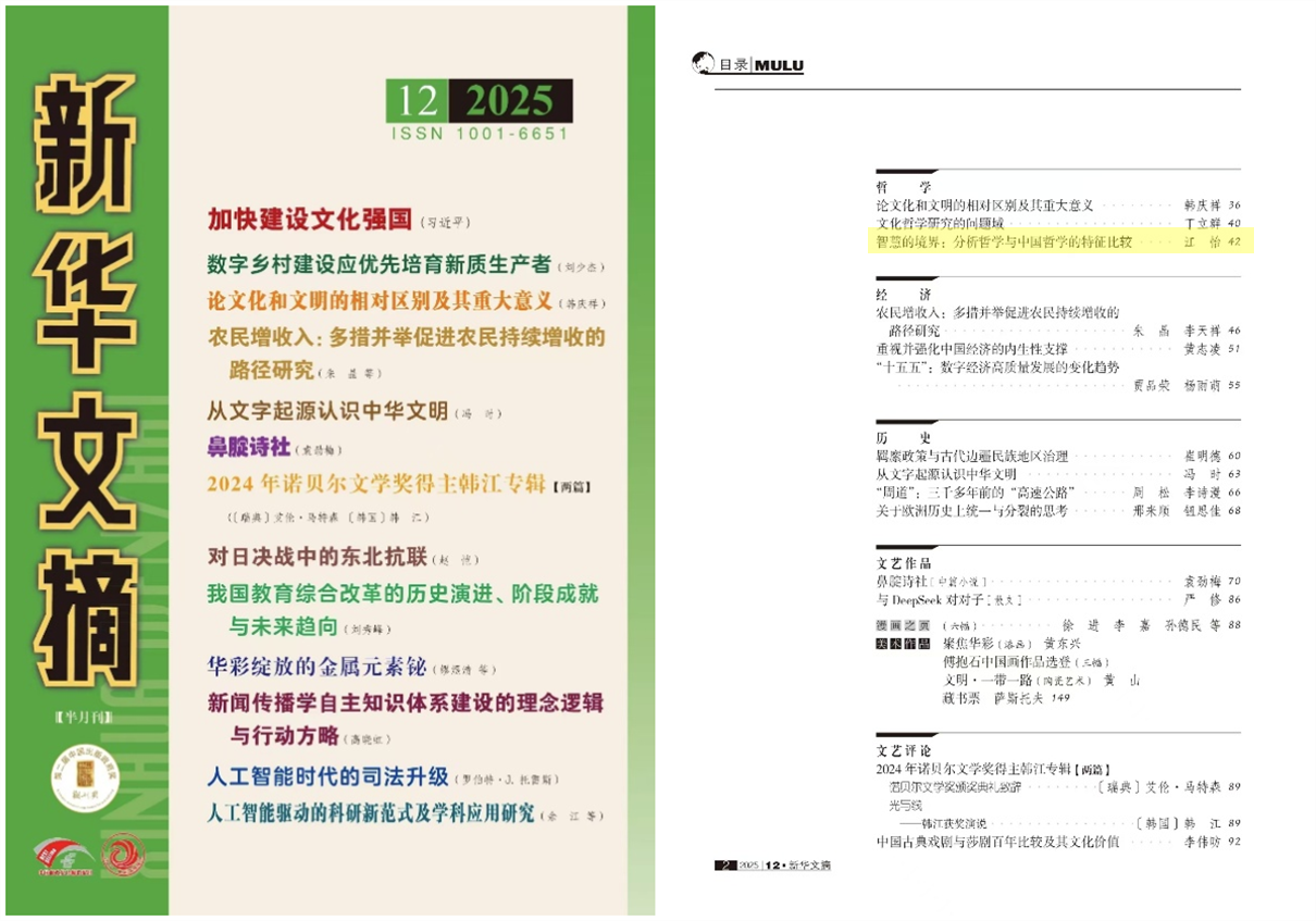 6月20日,《新华文摘》2025年第12期全文转载了江怡教授发表于《社会科学战线》2025年第3期的学术文章《智慧的境界:分析哲学与中国哲学的特征比较》。该文比较了这两种哲学的主要特征,认为它们体现出对待形而上学的不同态度、在实践智慧与知识追求上的不同方式、提出不同的理由陈述与推理要求,以及在哲学目标与哲学方法上形成了不同的理论说明。文章指出,分析哲学与中国哲学的根本差别在于智慧的不同境界,即在形而上学上的无形与有形之冲突、在实践上的行动在先与理由在先之分歧、在理论上的辩护说理与逻辑推理之对立,以及在哲学理想上的目标与方法之统一。